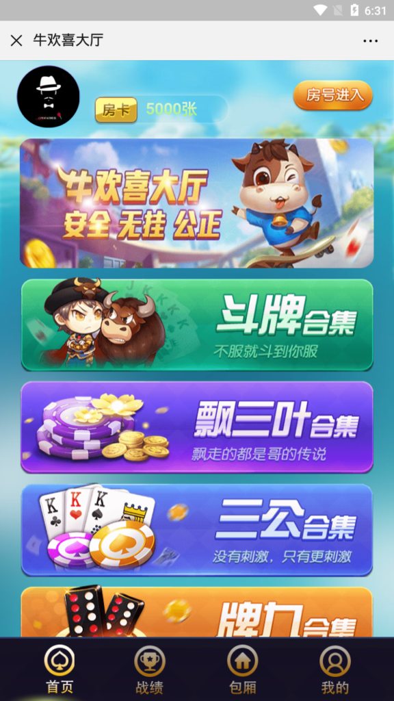 游戏包含牛牛、金花、斗地主、扣点麻将、血战麻将、双扣、十三水,所有游戏都能玩,后台带透视和胜率。