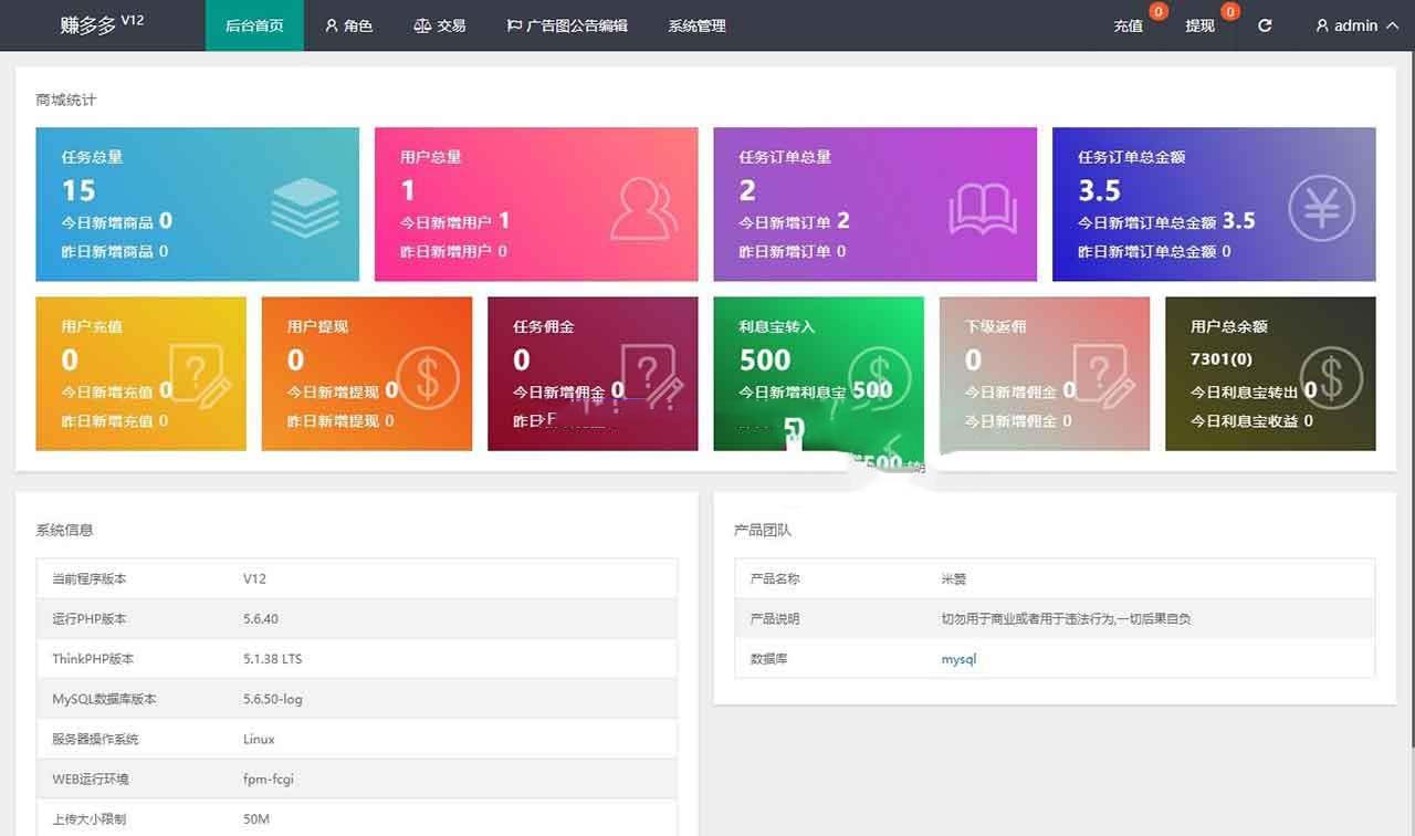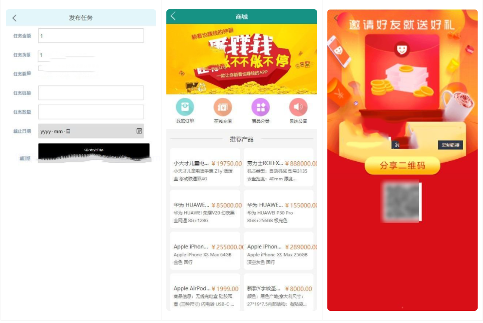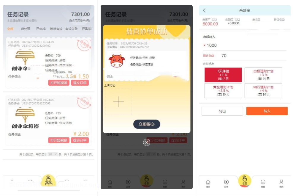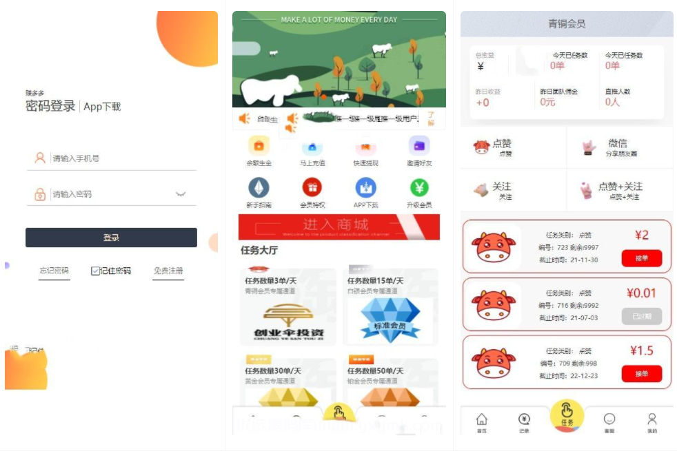 任务接单,主要分为抖音和快手任务关注点赞,用户可以领取符合要求的任务,任务直接打开app关注和点赞,截图提交,后台审核通过后即可领取佣金。推广为三级分销后台可以设置。余额宝分为定数时间,合约到就会产生收益。添加商城,前台发布任务,短信切换三种接口。增加暗扣功能。