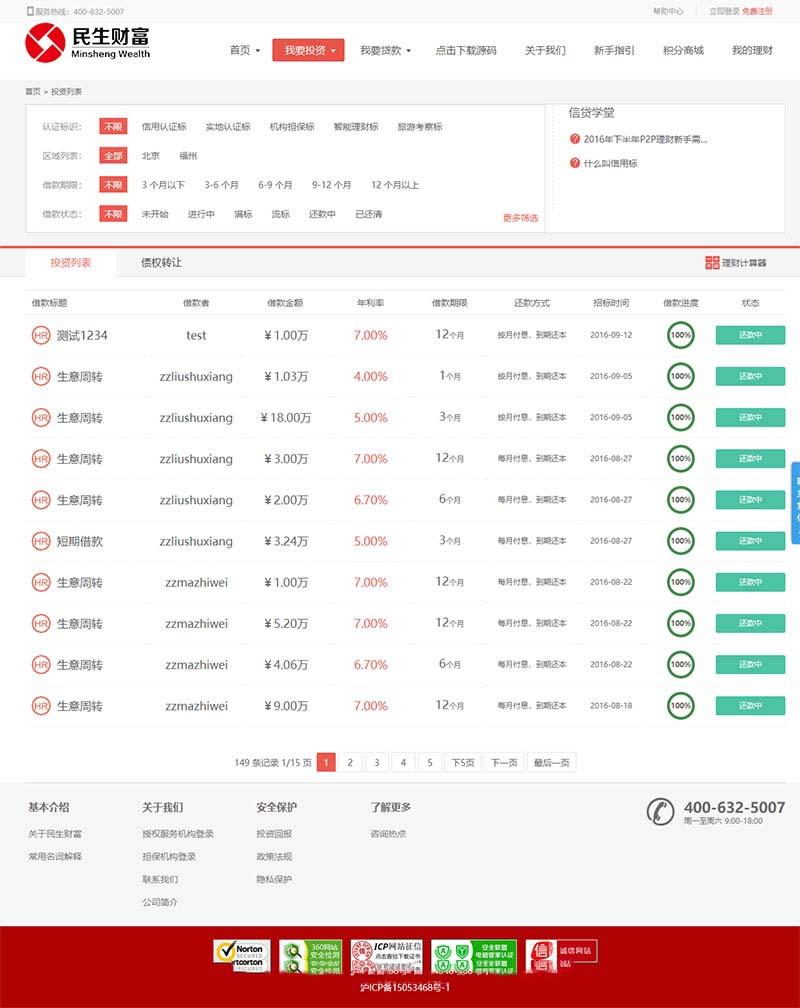 民生财富专业P2P网络贷款借贷系统投资理财平台网站源码